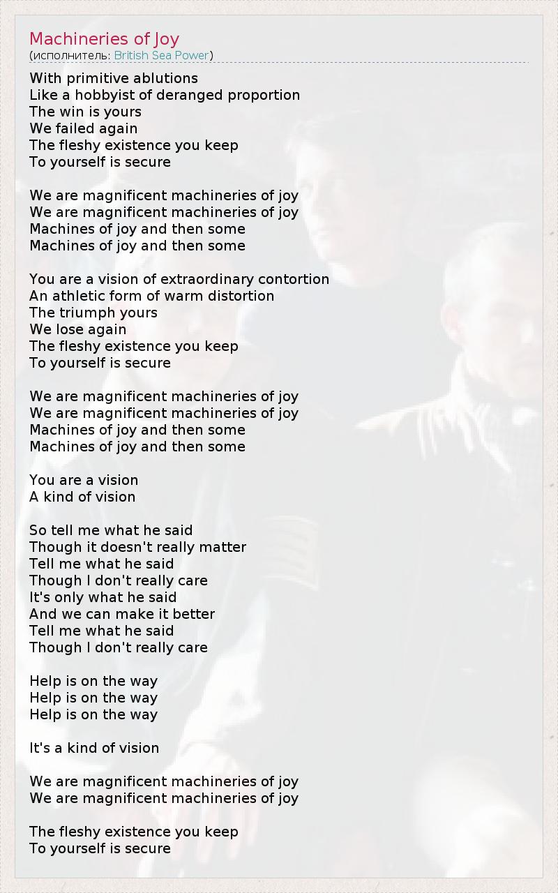 With primitive ablutions Like a hobbyist of deranged proportion The win is yours We failed again The fleshy existence you keep To yourself is secure We are magnificent machineries of joy We are magnificent machineries of joy Machines of joy and then some Machines of joy and then some You are a vision of extraordinary contortion An athletic form of warm distortion The triumph yours We lose again The fleshy existence you keep To yourself is secure We are magnificent machineries of joy We are magnificent machineries of joy Machines of joy and then some Machines of joy and then some You are a vision A kind of vision So tell me what he said Though it doesn't really matter Tell me what he said Though I don't really care It's only what he said And we can make it better Tell me what he said Though I don't really care Help is on the way Help is on the way Help is on the way It's a kind of vision We are magnificent machineries of joy We are magnificent machineries of joy The fleshy existence you keep To yourself is secure