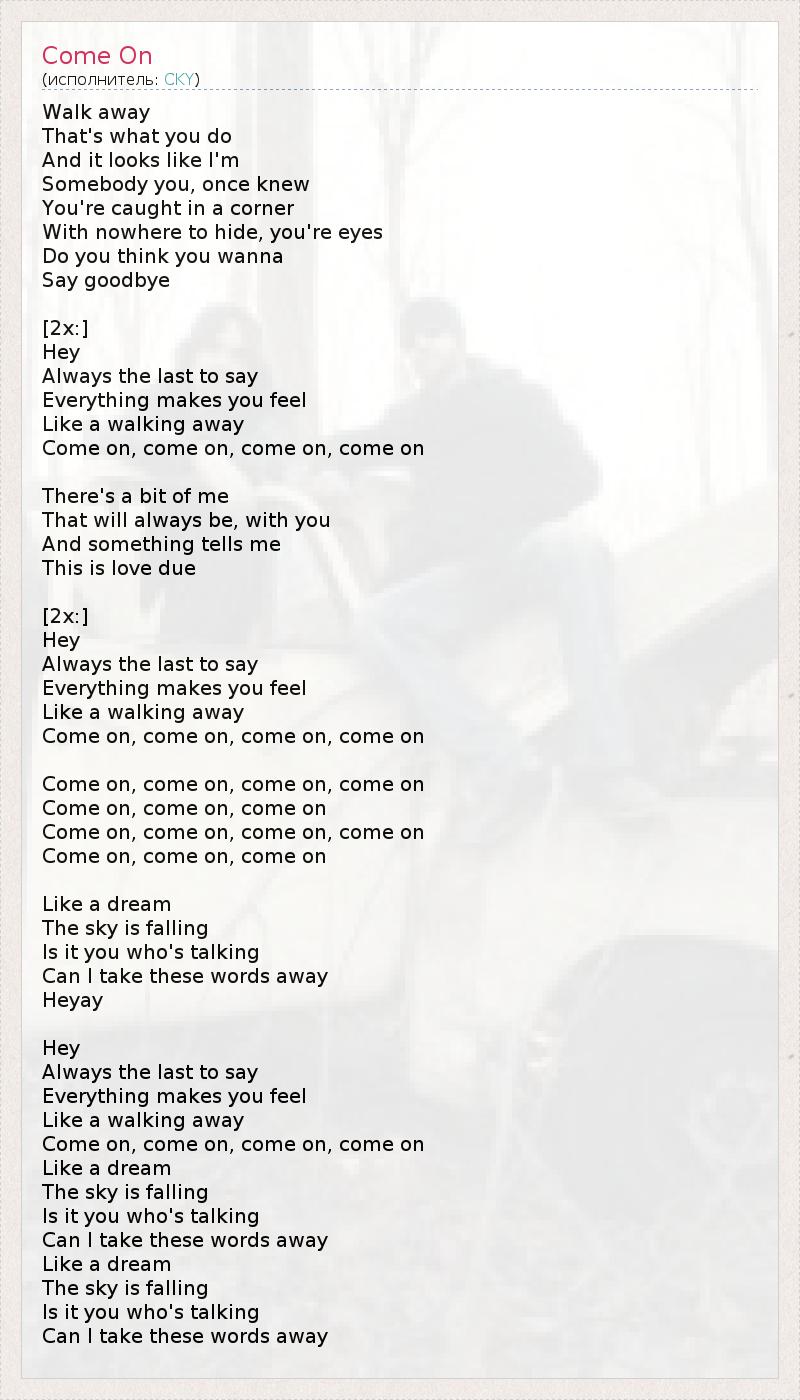 Walk away That's what you do And it looks like I'm Somebody you, once knew You're caught in a corner With nowhere to hide, you're eyes Do you think you wanna Say goodbye [2x:] Hey Always the last to say Everything makes you feel Like a walking away Come on, come on, come on, come on There's a bit of me That will always be, with you And something tells me This is love due [2x:] Hey Always the last to say Everything makes you feel Like a walking away Come on, come on, come on, come on Come on, come on, come on, come on Come on, come on, come on Come on, come on, come on, come on Come on, come on, come on Like a dream The sky is falling Is it you who's talking Can I take these words away Heyay Hey Always the last to say Everything makes you feel Like a walking away Come on, come on, come on, come on Like a dream The sky is falling Is it you who's talking Can I take these words away Like a dream The sky is falling Is it you who's talking Can I take these words away