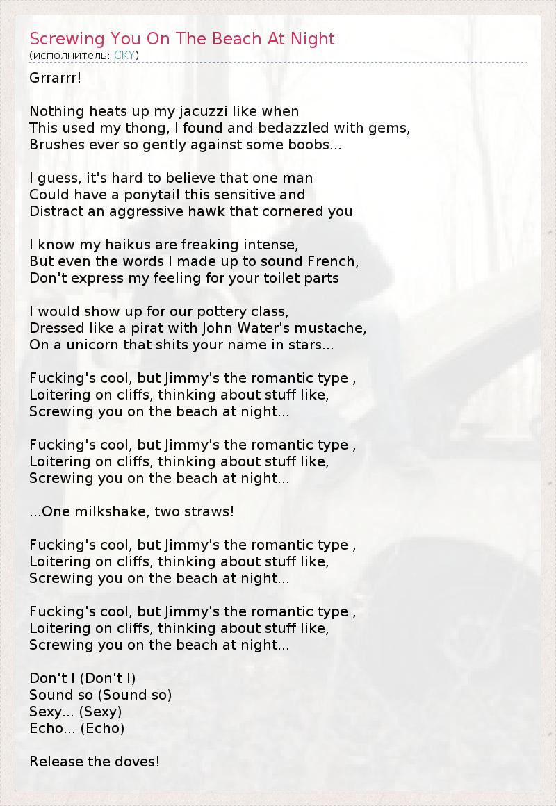 Grrarrr! Nothing heats up my jacuzzi like when This used my thong, I found and bedazzled with gems, Brushes ever so gently against some boobs... I guess, it's hard to believe that one man Could have a ponytail this sensitive and Distract an aggressive hawk that cornered you I know my haikus are freaking intense, But even the words I made up to sound French, Don't express my feeling for your toilet parts I would show up for our pottery class, Dressed like a pirat with John Water's mustache, On a unicorn that shits your name in stars... Fucking's cool, but Jimmy's the romantic type , Loitering on cliffs, thinking about stuff like, Screwing you on the beach at night... Fucking's cool, but Jimmy's the romantic type , Loitering on cliffs, thinking about stuff like, Screwing you on the beach at night... ...One milkshake, two straws! Fucking's cool, but Jimmy's the romantic type , Loitering on cliffs, thinking about stuff like, Screwing you on the beach at night... Fucking's cool, but Jimmy's the romantic type , Loitering on cliffs, thinking about stuff like, Screwing you on the beach at night... Don't I (Don't I) Sound so (Sound so) Sexy... (Sexy) Echo... (Echo) Release the doves!