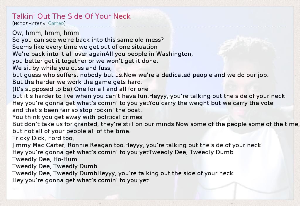 Ow, hmm, hmm, hmm So you can see we're back into this same old mess? Seems like every time we get out of one situation We're back into it all over againAll you people in Washington, you better get it together or we won't get it done. We sit by while you cuss and fuss, but guess who suffers, nobody but us.Now we're a dedicated people and we do our job. But the harder we work the game gets hard. (It's supposed to be) One for all and all for one but it's harder to live when you can't have fun.Heyyy, you're talking out the side of your neck Hey you're gonna get what's comin' to you yetYou carry the weight but we carry the vote and that's been fair so stop rockin' the boat. You think you get away with political crimes. But don't take us for granted, they're still on our minds.Now some of the people some of the time, but not all of your people all of the time. Tricky Dick, Ford too, Jimmy Mac Carter, Ronnie Reagan too.Heyyy, you're talking out the side of your neck Hey you're gonna get what's comin' to you yetTweedly Dee, Tweedly Dumb Tweedly Dee, Ho-Hum Tweedly Dee, Tweedly Dumb Tweedly Dee, Tweedly DumbHeyyy, you're talking out the side of your neck Hey you're gonna get what's comin' to you yet ...