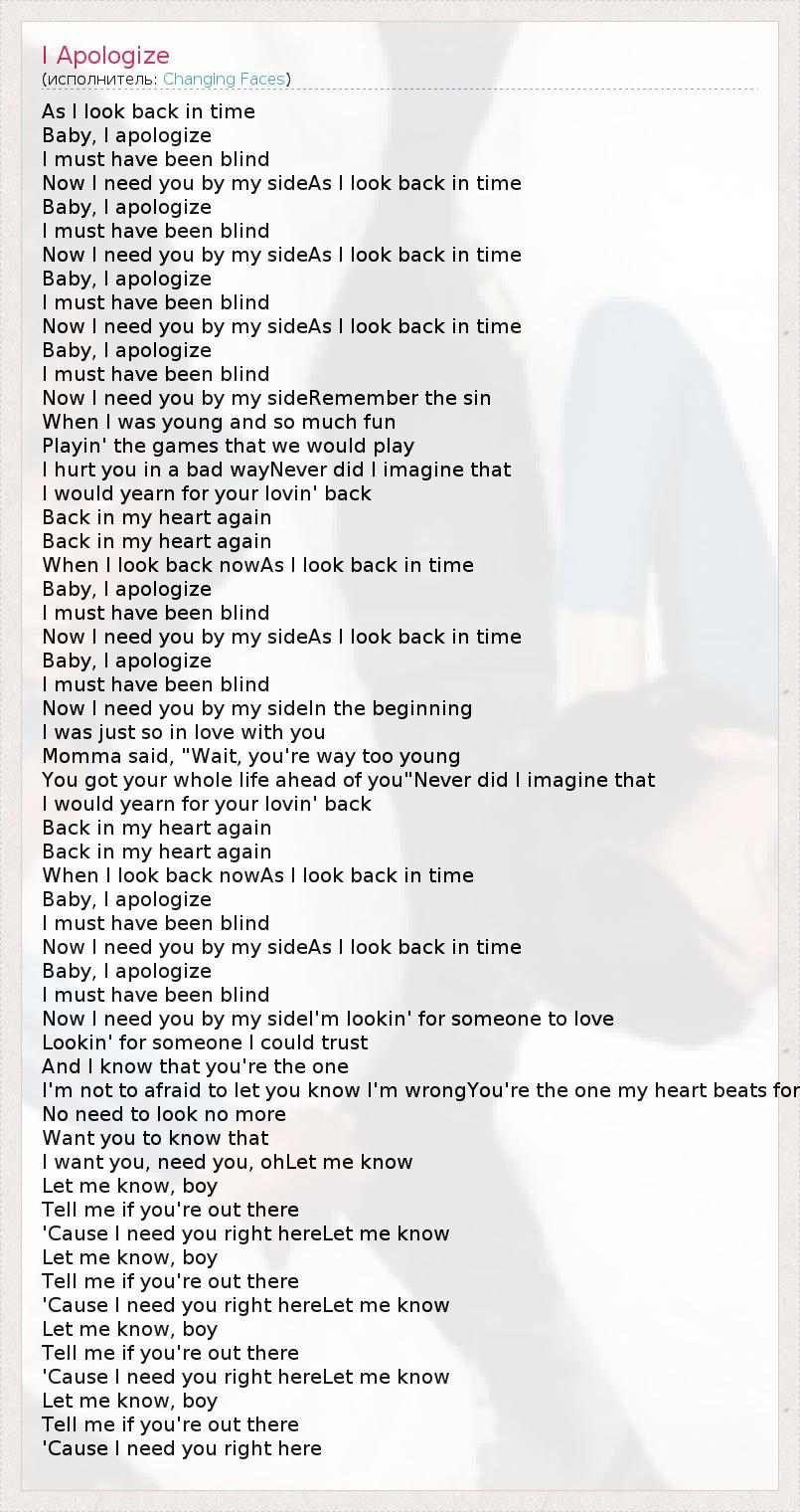 As I look back in time Baby, I apologize I must have been blind Now I need you by my sideAs I look back in time Baby, I apologize I must have been blind Now I need you by my sideAs I look back in time Baby, I apologize I must have been blind Now I need you by my sideAs I look back in time Baby, I apologize I must have been blind Now I need you by my sideRemember the sin When I was young and so much fun Playin' the games that we would play I hurt you in a bad wayNever did I imagine that I would yearn for your lovin' back Back in my heart again Back in my heart again When I look back nowAs I look back in time Baby, I apologize I must have been blind Now I need you by my sideAs I look back in time Baby, I apologize I must have been blind Now I need you by my sideIn the beginning I was just so in love with you Momma said, "Wait, you're way too young You got your whole life ahead of you"Never did I imagine that I would yearn for your lovin' back Back in my heart again Back in my heart again When I look back nowAs I look back in time Baby, I apologize I must have been blind Now I need you by my sideAs I look back in time Baby, I apologize I must have been blind Now I need you by my sideI'm lookin' for someone to love Lookin' for someone I could trust And I know that you're the one I'm not to afraid to let you know I'm wrongYou're the one my heart beats for No need to look no more Want you to know that I want you, need you, ohLet me know Let me know, boy Tell me if you're out there 'Cause I need you right hereLet me know Let me know, boy Tell me if you're out there 'Cause I need you right hereLet me know Let me know, boy Tell me if you're out there 'Cause I need you right hereLet me know Let me know, boy Tell me if you're out there 'Cause I need you right here