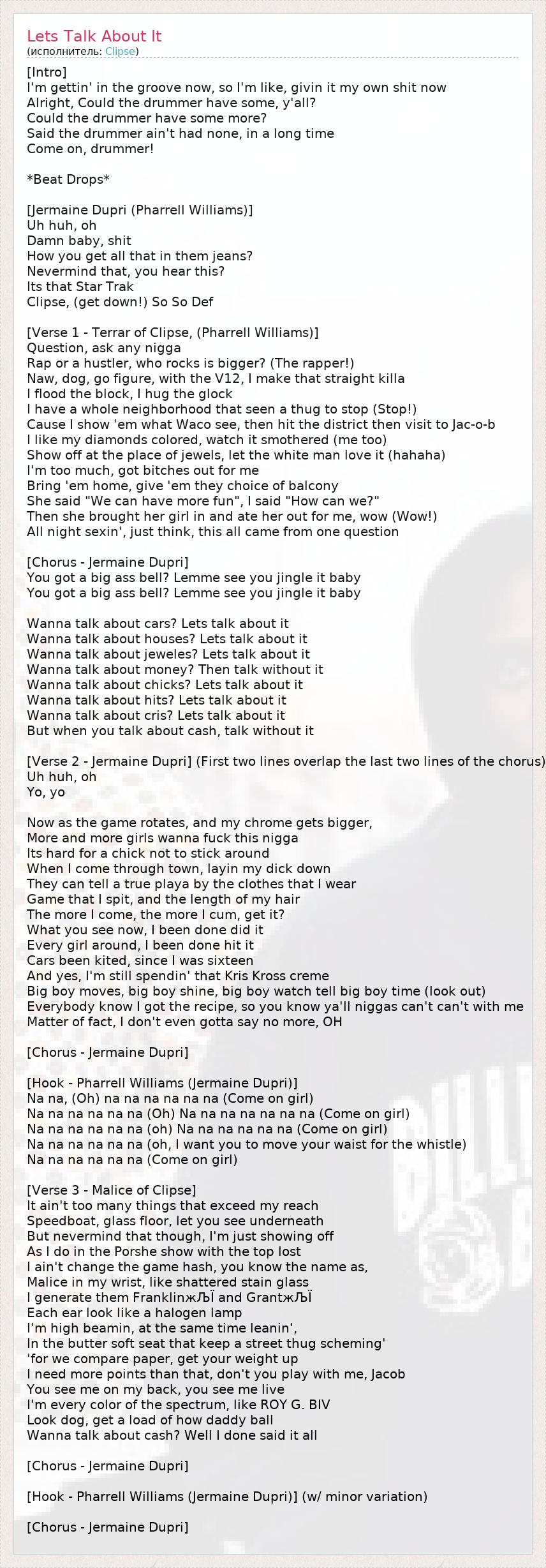 [Intro] I'm gettin' in the groove now, so I'm like, givin it my own shit now Alright, Could the drummer have some, y'all? Could the drummer have some more? Said the drummer ain't had none, in a long time Come on, drummer! *Beat Drops* [Jermaine Dupri (Pharrell Williams)] Uh huh, oh Damn baby, shit How you get all that in them jeans? Nevermind that, you hear this? Its that Star Trak Clipse, (get down!) So So Def [Verse 1 - Terrar of Clipse, (Pharrell Williams)] Question, ask any nigga Rap or a hustler, who rocks is bigger? (The rapper!) Naw, dog, go figure, with the V12, I make that straight killa I flood the block, I hug the glock I have a whole neighborhood that seen a thug to stop (Stop!) Cause I show 'em what Waco see, then hit the district then visit to Jac-o-b I like my diamonds colored, watch it smothered (me too) Show off at the place of jewels, let the white man love it (hahaha) I'm too much, got bitches out for me Bring 'em home, give 'em they choice of balcony She said "We can have more fun", I said "How can we?" Then she brought her girl in and ate her out for me, wow (Wow!) All night sexin', just think, this all came from one question [Chorus - Jermaine Dupri] You got a big ass bell? Lemme see you jingle it baby You got a big ass bell? Lemme see you jingle it baby Wanna talk about cars? Lets talk about it Wanna talk about houses? Lets talk about it Wanna talk about jeweles? Lets talk about it Wanna talk about money? Then talk without it Wanna talk about chicks? Lets talk about it Wanna talk about hits? Lets talk about it Wanna talk about cris? Lets talk about it But when you talk about cash, talk without it [Verse 2 - Jermaine Dupri] (First two lines overlap the last two lines of the chorus) Uh huh, oh Yo, yo Now as the game rotates, and my chrome gets bigger, More and more girls wanna fuck this nigga Its hard for a chick not to stick around When I come through town, layin my dick down They can tell a true playa by the clothes that I wear Game that I spit, and the length of my hair The more I come, the more I cum, get it? What you see now, I been done did it Every girl around, I been done hit it Cars been kited, since I was sixteen And yes, I'm still spendin' that Kris Kross creme Big boy moves, big boy shine, big boy watch tell big boy time (look out) Everybody know I got the recipe, so you know ya'll niggas can't can't with me Matter of fact, I don't even gotta say no more, OH [Chorus - Jermaine Dupri] [Hook - Pharrell Williams (Jermaine Dupri)] Na na, (Oh) na na na na na na (Come on girl) Na na na na na na (Oh) Na na na na na na na (Come on girl) Na na na na na na (oh) Na na na na na na (Come on girl) Na na na na na na (oh, I want you to move your waist for the whistle) Na na na na na na (Come on girl) [Verse 3 - Malice of Clipse] It ain't too many things that exceed my reach Speedboat, glass floor, let you see underneath But nevermind that though, I'm just showing off As I do in the Porshe show with the top lost I ain't change the game hash, you know the name as, Malice in my wrist, like shattered stain glass I generate them FranklinжЉЇ and GrantжЉЇ Each ear look like a halogen lamp I'm high beamin, at the same time leanin', In the butter soft seat that keep a street thug scheming' 'for we compare paper, get your weight up I need more points than that, don't you play with me, Jacob You see me on my back, you see me live I'm every color of the spectrum, like ROY G. BIV Look dog, get a load of how daddy ball Wanna talk about cash? Well I done said it all [Chorus - Jermaine Dupri] [Hook - Pharrell Williams (Jermaine Dupri)] (w/ minor variation) [Chorus - Jermaine Dupri]