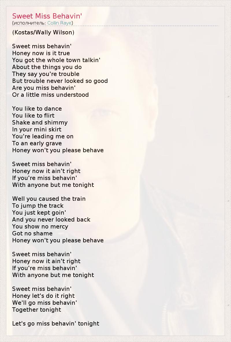 (Kostas/Wally Wilson) Sweet miss behavin' Honey now is it true You got the whole town talkin' About the things you do They say you're trouble But trouble never looked so good Are you miss behavin' Or a little miss understood You like to dance You like to flirt Shake and shimmy In your mini skirt You're leading me on To an early grave Honey won't you please behave Sweet miss behavin' Honey now it ain't right If you're miss behavin' With anyone but me tonight Well you caused the train To jump the track You just kept goin' And you never looked back You show no mercy Got no shame Honey won't you please behave Sweet miss behavin' Honey now it ain't right If you're miss behavin' With anyone but me tonight Sweet miss behavin' Honey let's do it right We'll go miss behavin' Together tonight Let's go miss behavin' tonight