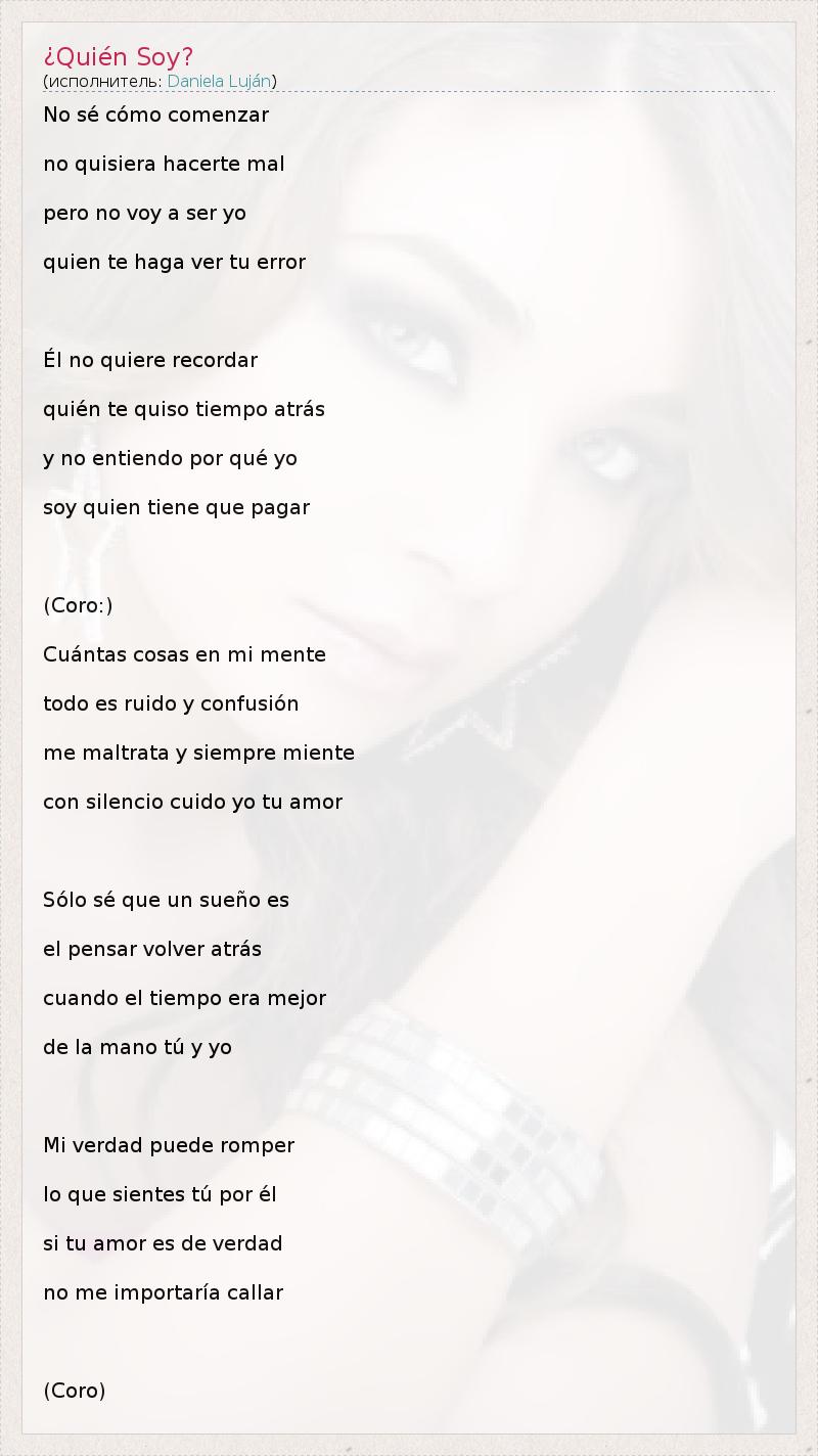 No sé cómo comenzar no quisiera hacerte mal pero no voy a ser yo quien te haga ver tu error Él no quiere recordar quién te quiso tiempo atrás y no entiendo por qué yo soy quien tiene que pagar (Coro:) Cuántas cosas en mi mente todo es ruido y confusión me maltrata y siempre miente con silencio cuido yo tu amor Sólo sé que un sueño es el pensar volver atrás cuando el tiempo era mejor de la mano tú y yo Mi verdad puede romper lo que sientes tú por él si tu amor es de verdad no me importaría callar (Coro)