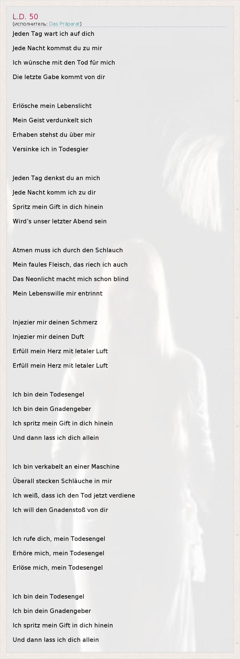 Jeden Tag wart ich auf dich Jede Nacht kommst du zu mir Ich wünsche mit den Tod für mich Die letzte Gabe kommt von dir Erlösche mein Lebenslicht Mein Geist verdunkelt sich Erhaben stehst du über mir Versinke ich in Todesgier Jeden Tag denkst du an mich Jede Nacht komm ich zu dir Spritz mein Gift in dich hinein Wird’s unser letzter Abend sein Atmen muss ich durch den Schlauch Mein faules Fleisch, das riech ich auch Das Neonlicht macht mich schon blind Mein Lebenswille mir entrinnt Injezier mir deinen Schmerz Injezier mir deinen Duft Erfüll mein Herz mit letaler Luft Erfüll mein Herz mit letaler Luft Ich bin dein Todesengel Ich bin dein Gnadengeber Ich spritz mein Gift in dich hinein Und dann lass ich dich allein Ich bin verkabelt an einer Maschine Überall stecken Schläuche in mir Ich weiß, dass ich den Tod jetzt verdiene Ich will den Gnadenstoß von dir Ich rufe dich, mein Todesengel Erhöre mich, mein Todesengel Erlöse mich, mein Todesengel Ich bin dein Todesengel Ich bin dein Gnadengeber Ich spritz mein Gift in dich hinein Und dann lass ich dich allein