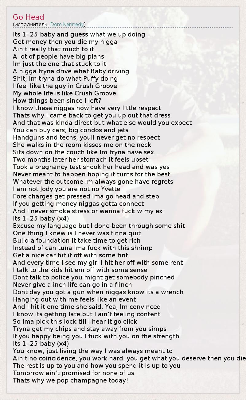 Its 1: 25 baby and guess what we up doing Get money then you die my nigga Ain't really that much to it A lot of people have big plans Im just the one that stuck to it A nigga tryna drive what Baby driving Shit, Im tryna do what Puffy doing I feel like the guy in Crush Groove My whole life is like Crush Groove How things been since I left? I know these niggas now have very little respect Thats why I came back to get you up out that dress And that was kinda direct but what else would you expect You can buy cars, big condos and jets Handguns and techs, youll never get no respect She walks in the room kisses me on the neck Sits down on the couch like Im tryna have sex Two months later her stomach it feels upset Took a pregnancy test shook her head and was yes Never meant to happen hoping it turns for the best Whatever the outcome Im always gone have regrets I am not Jody you are not no Yvette Fore charges get pressed Ima go head and step If you getting money niggas gotta connect And I never smoke stress or wanna fuck w my ex Its 1: 25 baby (x4) Excuse my language but I done been through some shit One thing I knew is I never was finna quit Build a foundation it take time to get rich Instead of can tuna Ima fuck with this shrimp Get a nice car hit it off with some tint And every time I see my girl I hit her off with some rent I talk to the kids hit em off with some sense Dont talk to police you might get somebody pinched Never give a inch life can go in a flinch Dont day you got a gun when niggas know its a wrench Hanging out with me feels like an event And I hit it one time she said, Yea, Im convinced I know its getting late but I ain't feeling content So Ima pick this lock till I hear it go click Tryna get my chips and stay away from you simps If you happy being you I fuck with you on the strength Its 1: 25 baby (x4) You know, just living the way I was always meant to Ain't no coincidence, you work hard, you get what you deserve then you die The rest is up to you and how you spend it is up to you Tomorrow ain't promised for none of us Thats why we pop champagne today!