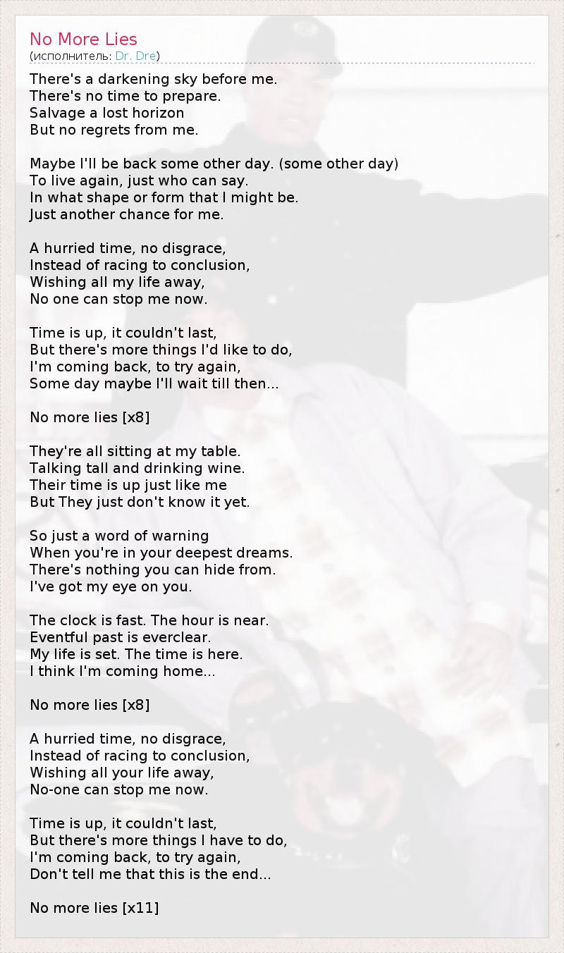 There's a darkening sky before me. There's no time to prepare. Salvage a lost horizon But no regrets from me. Maybe I'll be back some other day. (some other day) To live again, just who can say. In what shape or form that I might be. Just another chance for me. A hurried time, no disgrace, Instead of racing to conclusion, Wishing all my life away, No one can stop me now. Time is up, it couldn't last, But there's more things I'd like to do, I'm coming back, to try again, Some day maybe I'll wait till then... No more lies [x8] They're all sitting at my table. Talking tall and drinking wine. Their time is up just like me But They just don't know it yet. So just a word of warning When you're in your deepest dreams. There's nothing you can hide from. I've got my eye on you. The clock is fast. The hour is near. Eventful past is everclear. My life is set. The time is here. I think I'm coming home... No more lies [x8] A hurried time, no disgrace, Instead of racing to conclusion, Wishing all your life away, No-one can stop me now. Time is up, it couldn't last, But there's more things I have to do, I'm coming back, to try again, Don't tell me that this is the end... No more lies [x11]