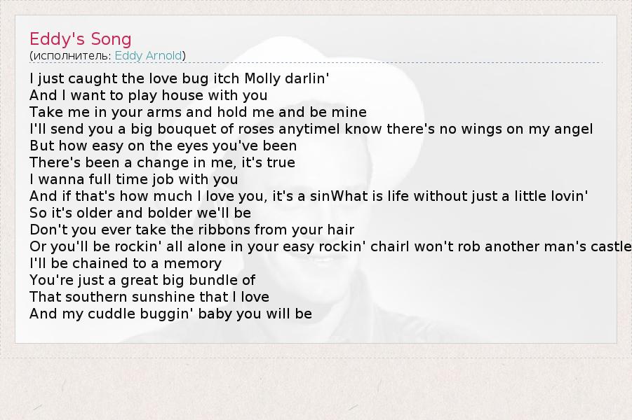Это интересно:Эдди Арнольд ((May 15, 1918 – May 8, 2008) - один из самых популярных музыкантов и исполнителей в американской истории. Песни Арнольда пользовались и до сих пор пользуются большим успехом среди огромного числа слушателей. Всего было распродано около 85-ти миллионов записей, с хитами известного музыканта. Более 100-а песен Ричарда постоянно оказывались в рейтинге лучших хитов американской музыки.... продолжение