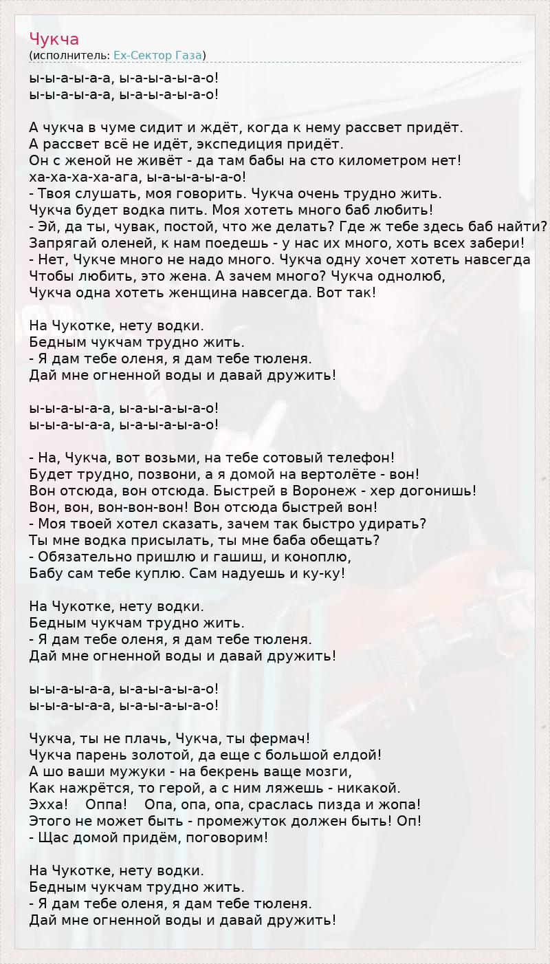 ы-ы-а-ы-а-а, ы-а-ы-а-ы-а-о! ы-ы-а-ы-а-а, ы-а-ы-а-ы-а-о! А чукча в чуме сидит и ждёт, когда к нему рассвет придёт. А рассвет всё не идёт, экспедиция придёт. Он с женой не живёт - да там бабы на сто километром нет! ха-ха-ха-ха-ага, ы-а-ы-а-ы-а-о! - Твоя слушать, моя говорить. Чукча очень трудно жить. Чукча будет водка пить. Моя хотеть много баб любить! - Эй, да ты, чувак, постой, что же делать? Где ж тебе здесь баб найти? Запрягай оленей, к нам поедешь - у нас их много, хоть всех забери! - Нет, Чукче много не надо много. Чукча одну хочет хотеть навсегда Чтобы любить, это жена. А зачем много? Чукча однолюб, Чукча одна хотеть женщина навсегда. Вот так! На Чукотке, нету водки. Бедным чукчам трудно жить. - Я дам тебе оленя, я дам тебе тюленя. Дай мне огненной воды и давай дружить! ы-ы-а-ы-а-а, ы-а-ы-а-ы-а-о! ы-ы-а-ы-а-а, ы-а-ы-а-ы-а-о! - На, Чукча, вот возьми, на тебе сотовый телефон! Будет трудно, позвони, а я домой на вертолёте - вон! Вон отсюда, вон отсюда. Быстрей в Воронеж - хер догонишь! Вон, вон, вон-вон-вон! Вон отсюда быстрей вон! - Моя твоей хотел сказать, зачем так быстро удирать? Ты мне водка присылать, ты мне баба обещать? - Обязательно пришлю и гашиш, и коноплю, Бабу сам тебе куплю. Сам надуешь и ку-ку! На Чукотке, нету водки. Бедным чукчам трудно жить. - Я дам тебе оленя, я дам тебе тюленя. Дай мне огненной воды и давай дружить! ы-ы-а-ы-а-а, ы-а-ы-а-ы-а-о! ы-ы-а-ы-а-а, ы-а-ы-а-ы-а-о! Чукча, ты не плачь, Чукча, ты фермач! Чукча парень золотой, да еще с большой елдой! А шо ваши мужуки - на бекрень ваще мозги, Как нажрётся, то герой, а с ним ляжешь - никакой. Эхха! Оппа! Опа, опа, опа, сраслась пизда и жопа! Этого не может быть - промежуток должен быть! Оп! - Щас домой придём, поговорим! На Чукотке, нету водки. Бедным чукчам трудно жить. - Я дам тебе оленя, я дам тебе тюленя. Дай мне огненной воды и давай дружить!