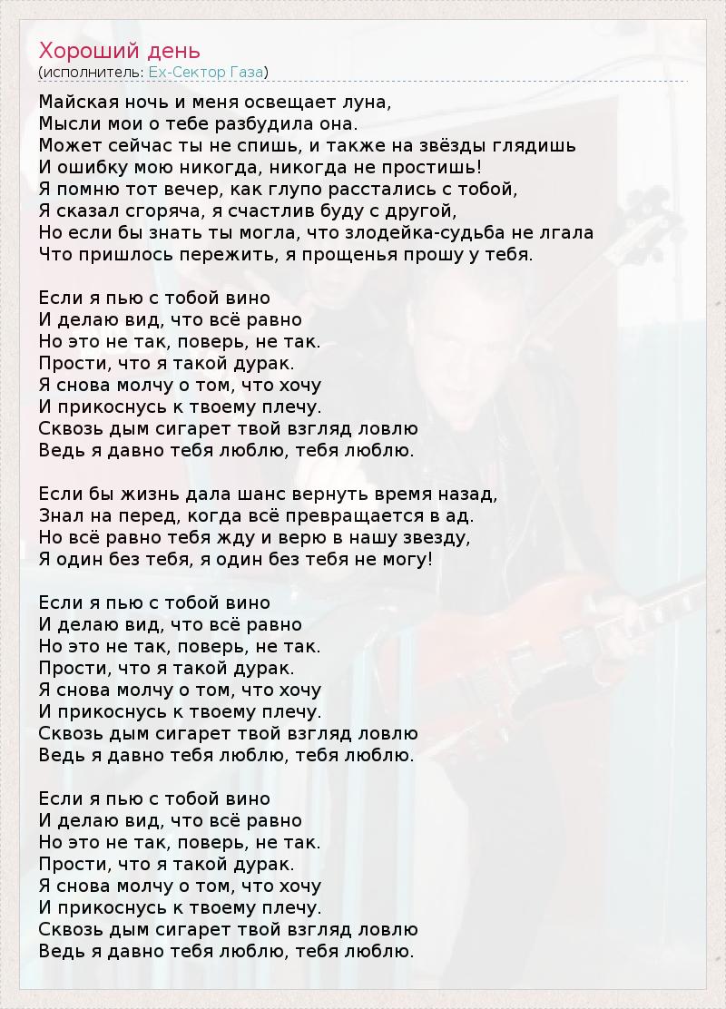 Майская ночь и меня освещает луна, Мысли мои о тебе разбудила она. Может сейчас ты не спишь, и также на звёзды глядишь И ошибку мою никогда, никогда не простишь! Я помню тот вечер, как глупо расстались с тобой, Я сказал сгоряча, я счастлив буду с другой, Но если бы знать ты могла, что злодейка-судьба не лгала Что пришлось пережить, я прощенья прошу у тебя. Если я пью с тобой вино И делаю вид, что всё равно Но это не так, поверь, не так. Прости, что я такой дурак. Я снова молчу о том, что хочу И прикоснусь к твоему плечу. Сквозь дым сигарет твой взгляд ловлю Ведь я давно тебя люблю, тебя люблю. Если бы жизнь дала шанс вернуть время назад, Знал на перед, когда всё превращается в ад. Но всё равно тебя жду и верю в нашу звезду, Я один без тебя, я один без тебя не могу! Если я пью с тобой вино И делаю вид, что всё равно Но это не так, поверь, не так. Прости, что я такой дурак. Я снова молчу о том, что хочу И прикоснусь к твоему плечу. Сквозь дым сигарет твой взгляд ловлю Ведь я давно тебя люблю, тебя люблю. Если я пью с тобой вино И делаю вид, что всё равно Но это не так, поверь, не так. Прости, что я такой дурак. Я снова молчу о том, что хочу И прикоснусь к твоему плечу. Сквозь дым сигарет твой взгляд ловлю Ведь я давно тебя люблю, тебя люблю.