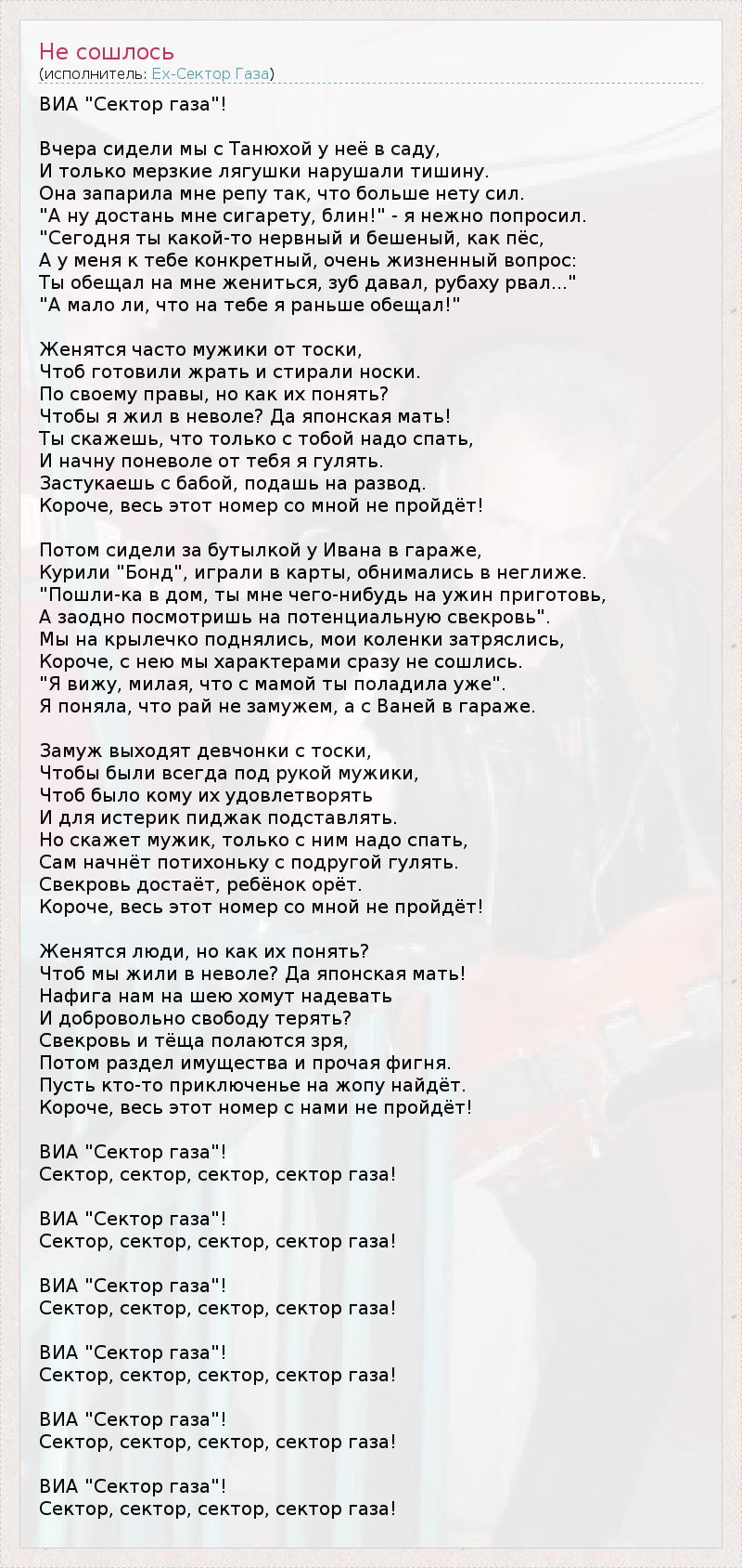 ВИА "Сектор газа"! Вчера сидели мы с Танюхой у неё в саду, И только мерзкие лягушки нарушали тишину. Она запарила мне репу так, что больше нету сил. "А ну достань мне сигарету, блин!" - я нежно попросил. "Сегодня ты какой-то нервный и бешеный, как пёс, А у меня к тебе конкретный, очень жизненный вопрос: Ты обещал на мне жениться, зуб давал, рубаху рвал..." "А мало ли, что на тебе я раньше обещал!" Женятся часто мужики от тоски, Чтоб готовили жрать и стирали носки. По своему правы, но как их понять? Чтобы я жил в неволе? Да японская мать! Ты скажешь, что только с тобой надо спать, И начну поневоле от тебя я гулять. Застукаешь с бабой, подашь на развод. Короче, весь этот номер со мной не пройдёт! Потом сидели за бутылкой у Ивана в гараже, Курили "Бонд", играли в карты, обнимались в неглиже. "Пошли-ка в дом, ты мне чего-нибудь на ужин приготовь, А заодно посмотришь на потенциальную свекровь". Мы на крылечко поднялись, мои коленки затряслись, Короче, с нею мы характерами сразу не сошлись. "Я вижу, милая, что с мамой ты поладила уже". Я поняла, что рай не замужем, а с Ваней в гараже. Замуж выходят девчонки с тоски, Чтобы были всегда под рукой мужики, Чтоб было кому их удовлетворять И для истерик пиджак подставлять. Но скажет мужик, только с ним надо спать, Сам начнёт потихоньку с подругой гулять. Свекровь достаёт, ребёнок орёт. Короче, весь этот номер со мной не пройдёт! Женятся люди, но как их понять? Чтоб мы жили в неволе? Да японская мать! Нафига нам на шею хомут надевать И добровольно свободу терять? Свекровь и тёща полаются зря, Потом раздел имущества и прочая фигня. Пусть кто-то приключенье на жопу найдёт. Короче, весь этот номер с нами не пройдёт! ВИА "Сектор газа"! Сектор, сектор, сектор, сектор газа! ВИА "Сектор газа"! Сектор, сектор, сектор, сектор газа! ВИА "Сектор газа"! Сектор, сектор, сектор, сектор газа! ВИА "Сектор газа"! Сектор, сектор, сектор, сектор газа! ВИА "Сектор газа"! Сектор, сектор, сектор, сектор газа! ВИА "Сектор газа"! Сектор, сектор, сектор, сектор газа!