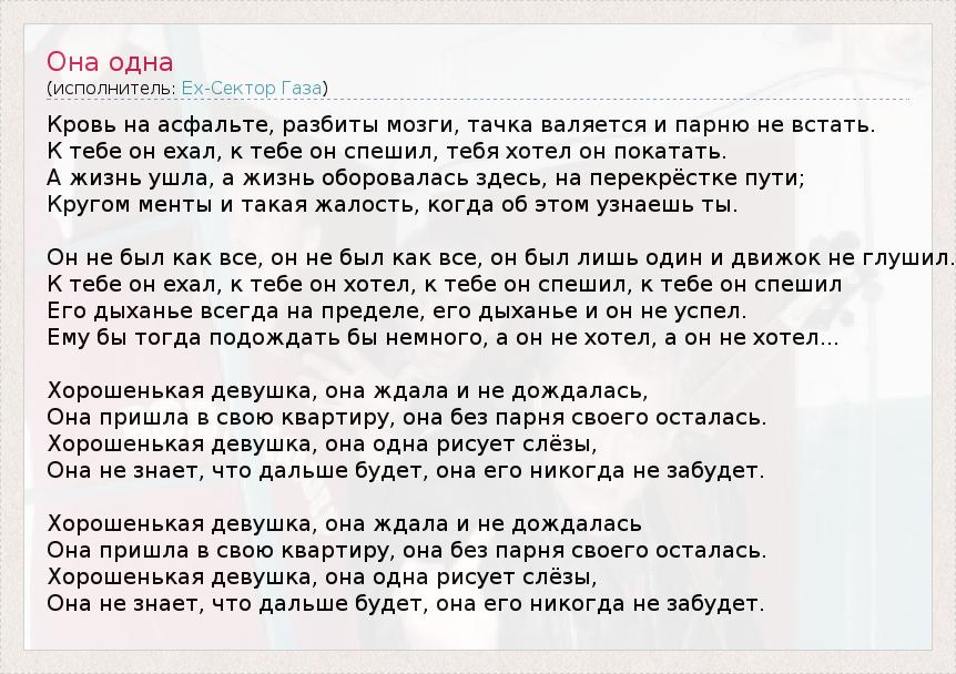 Кровь на асфальте, разбиты мозги, тачка валяется и парню не встать. К тебе он ехал, к тебе он спешил, тебя хотел он покатать. А жизнь ушла, а жизнь оборовалась здесь, на перекрёстке пути; Кругом менты и такая жалость, когда об этом узнаешь ты. Он не был как все, он не был как все, он был лишь один и движок не глушил. К тебе он ехал, к тебе он хотел, к тебе он спешил, к тебе он спешил Его дыханье всегда на пределе, его дыханье и он не успел. Ему бы тогда подождать бы немного, а он не хотел, а он не хотел... Хорошенькая девушка, она ждала и не дождалась, Она пришла в свою квартиру, она без парня своего осталась. Хорошенькая девушка, она одна рисует слёзы, Она не знает, что дальше будет, она его никогда не забудет. Хорошенькая девушка, она ждала и не дождалась Она пришла в свою квартиру, она без парня своего осталась. Хорошенькая девушка, она одна рисует слёзы, Она не знает, что дальше будет, она его никогда не забудет.