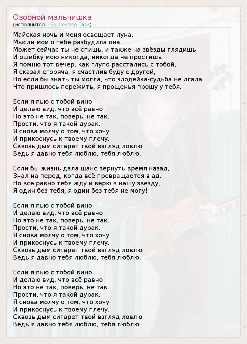 Майская ночь и меня освещает луна, Мысли мои о тебе разбудила она. Может сейчас ты не спишь, и также на звёзды глядишь И ошибку мою никогда, никогда не простишь! Я помню тот вечер, как глупо расстались с тобой, Я сказал сгоряча, я счастлив буду с другой, Но если бы знать ты могла, что злодейка-судьба не лгала Что пришлось пережить, я прощенья прошу у тебя. Если я пью с тобой вино И делаю вид, что всё равно Но это не так, поверь, не так. Прости, что я такой дурак. Я снова молчу о том, что хочу И прикоснусь к твоему плечу. Сквозь дым сигарет твой взгляд ловлю Ведь я давно тебя люблю, тебя люблю. Если бы жизнь дала шанс вернуть время назад, Знал на перед, когда всё превращается в ад. Но всё равно тебя жду и верю в нашу звезду, Я один без тебя, я один без тебя не могу! Если я пью с тобой вино И делаю вид, что всё равно Но это не так, поверь, не так. Прости, что я такой дурак. Я снова молчу о том, что хочу И прикоснусь к твоему плечу. Сквозь дым сигарет твой взгляд ловлю Ведь я давно тебя люблю, тебя люблю. Если я пью с тобой вино И делаю вид, что всё равно Но это не так, поверь, не так. Прости, что я такой дурак. Я снова молчу о том, что хочу И прикоснусь к твоему плечу. Сквозь дым сигарет твой взгляд ловлю Ведь я давно тебя люблю, тебя люблю.