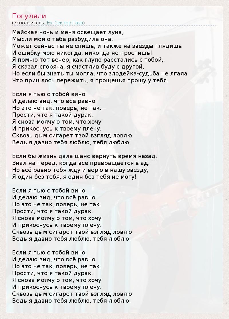 Майская ночь и меня освещает луна, Мысли мои о тебе разбудила она. Может сейчас ты не спишь, и также на звёзды глядишь И ошибку мою никогда, никогда не простишь! Я помню тот вечер, как глупо расстались с тобой, Я сказал сгоряча, я счастлив буду с другой, Но если бы знать ты могла, что злодейка-судьба не лгала Что пришлось пережить, я прощенья прошу у тебя. Если я пью с тобой вино И делаю вид, что всё равно Но это не так, поверь, не так. Прости, что я такой дурак. Я снова молчу о том, что хочу И прикоснусь к твоему плечу. Сквозь дым сигарет твой взгляд ловлю Ведь я давно тебя люблю, тебя люблю. Если бы жизнь дала шанс вернуть время назад, Знал на перед, когда всё превращается в ад. Но всё равно тебя жду и верю в нашу звезду, Я один без тебя, я один без тебя не могу! Если я пью с тобой вино И делаю вид, что всё равно Но это не так, поверь, не так. Прости, что я такой дурак. Я снова молчу о том, что хочу И прикоснусь к твоему плечу. Сквозь дым сигарет твой взгляд ловлю Ведь я давно тебя люблю, тебя люблю. Если я пью с тобой вино И делаю вид, что всё равно Но это не так, поверь, не так. Прости, что я такой дурак. Я снова молчу о том, что хочу И прикоснусь к твоему плечу. Сквозь дым сигарет твой взгляд ловлю Ведь я давно тебя люблю, тебя люблю.