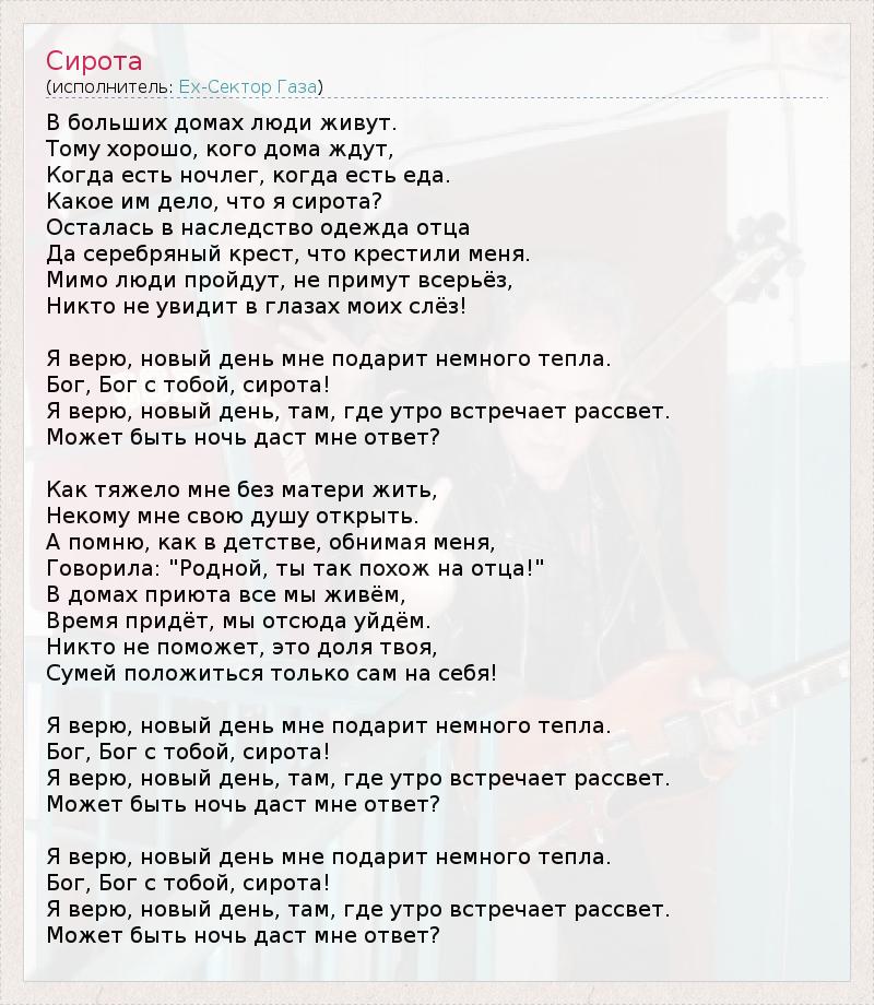 В больших домах люди живут. Тому хорошо, кого дома ждут, Когда есть ночлег, когда есть еда. Какое им дело, что я сирота? Осталась в наследство одежда отца Да серебряный крест, что крестили меня. Мимо люди пройдут, не примут всерьёз, Никто не увидит в глазах моих слёз! Я верю, новый день мне подарит немного тепла. Бог, Бог с тобой, сирота! Я верю, новый день, там, где утро встречает рассвет. Может быть ночь даст мне ответ? Как тяжело мне без матери жить, Некому мне свою душу открыть. А помню, как в детстве, обнимая меня, Говорила: "Родной, ты так похож на отца!" В домах приюта все мы живём, Время придёт, мы отсюда уйдём. Никто не поможет, это доля твоя, Сумей положиться только сам на себя! Я верю, новый день мне подарит немного тепла. Бог, Бог с тобой, сирота! Я верю, новый день, там, где утро встречает рассвет. Может быть ночь даст мне ответ? Я верю, новый день мне подарит немного тепла. Бог, Бог с тобой, сирота! Я верю, новый день, там, где утро встречает рассвет. Может быть ночь даст мне ответ?
