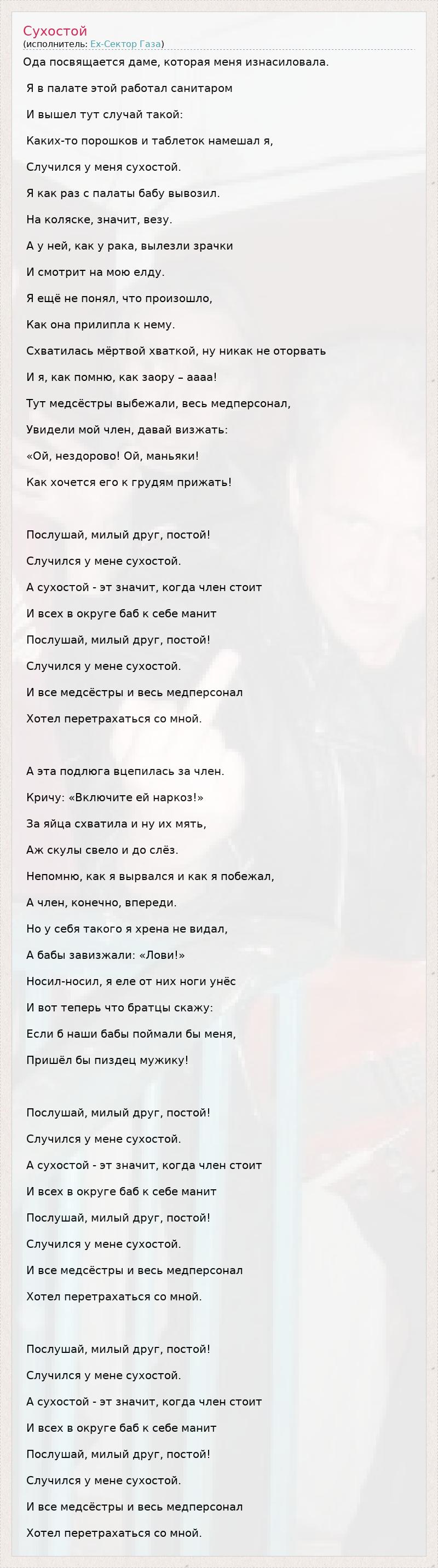 Ода посвящается даме, которая меня изнасиловала. Я в палате этой работал санитаром И вышел тут случай такой: Каких-то порошков и таблеток намешал я, Случился у меня сухостой. Я как раз с палаты бабу вывозил. На коляске, значит, везу. А у ней, как у рака, вылезли зрачки И смотрит на мою елду. Я ещё не понял, что произошло, Как она прилипла к нему. Схватилась мёртвой хваткой, ну никак не оторвать И я, как помню, как заору – аааа! Тут медсёстры выбежали, весь медперсонал, Увидели мой член, давай визжать: «Ой, нездорово! Ой, маньяки! Как хочется его к грудям прижать! Послушай, милый друг, постой! Случился у мене сухостой. А сухостой - эт значит, когда член стоит И всех в округе баб к себе манит Послушай, милый друг, постой! Случился у мене сухостой. И все медсёстры и весь медперсонал Хотел перетрахаться со мной. А эта подлюга вцепилась за член. Кричу: «Включите ей наркоз!» За яйца схватила и ну их мять, Аж скулы свело и до слёз. Непомню, как я вырвался и как я побежал, А член, конечно, впереди. Но у себя такого я хрена не видал, А бабы завизжали: «Лови!» Носил-носил, я еле от них ноги унёс И вот теперь что братцы скажу: Если б наши бабы поймали бы меня, Пришёл бы пиздец мужику! Послушай, милый друг, постой! Случился у мене сухостой. А сухостой - эт значит, когда член стоит И всех в округе баб к себе манит Послушай, милый друг, постой! Случился у мене сухостой. И все медсёстры и весь медперсонал Хотел перетрахаться со мной. Послушай, милый друг, постой! Случился у мене сухостой. А сухостой - эт значит, когда член стоит И всех в округе баб к себе манит Послушай, милый друг, постой! Случился у мене сухостой. И все медсёстры и весь медперсонал Хотел перетрахаться со мной.