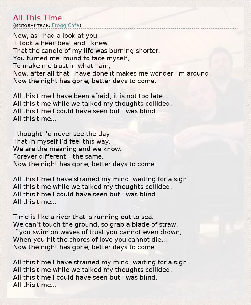 Теперь, когда я взглянул на тебя, Мое сердце замерло, и я понял, Что свеча моей жизни догорает. Ты повернула меня лицом к самому себе, Заставила меня поверить в себя. И после всего, что я сделал, удивительно, что я всё ещё здесь. И вот, ночь отступила, всё лучшее ещё впереди. Всё это время я боялся, что уже слишком поздно... Всё это время, пока мы говорили, в моей голове был беспорядок. Всё это время я мог бы видеть, но я был слеп. Всё это время... Я думал, что не доживу до дня, Когда во мне произойдут эти перемены. Смысл в нас, мы знаем. Такие разные, но так похожи. И вот, ночь отступила, всё лучшее ещё впереди. Всё это время я был в напряжении, в ожидании знака. Всё это время, пока мы говорили, в моей голове был беспорядок. Всё это время я мог бы видеть, но я был слеп. Всё это время... Время как река, которая впадает в море. Мы не можем дотянуться до дна и хватаемся за соломинку. Если ты плывешь на волнах доверия, ты не можешь утонуть, Когда ты достигнешь берега любви, ты не умрешь... И вот, ночь отступила, всё лучшее ещё впереди. Всё это время я был в напряжении, в ожидании знака. Всё это время, пока мы говорили, в моей голове был беспорядок. Всё это время я мог бы видеть, но я был слеп. Всё это время...