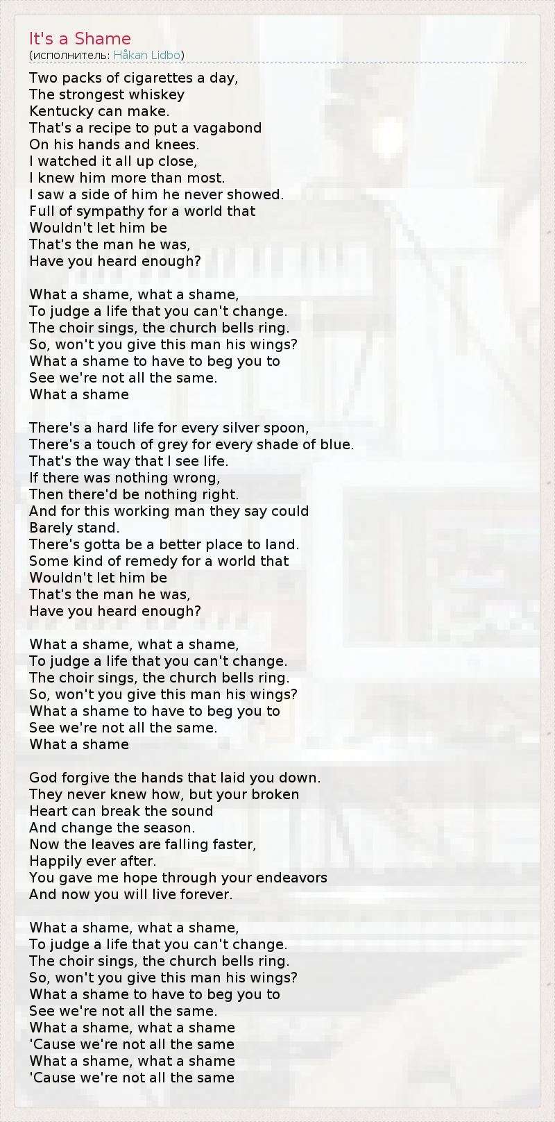 Two packs of cigarettes a day, The strongest whiskey Kentucky can make. That's a recipe to put a vagabond On his hands and knees. I watched it all up close, I knew him more than most. I saw a side of him he never showed. Full of sympathy for a world that Wouldn't let him be That's the man he was, Have you heard enough? What a shame, what a shame, To judge a life that you can't change. The choir sings, the church bells ring. So, won't you give this man his wings? What a shame to have to beg you to See we're not all the same. What a shame There's a hard life for every silver spoon, There's a touch of grey for every shade of blue. That's the way that I see life. If there was nothing wrong, Then there'd be nothing right. And for this working man they say could Barely stand. There's gotta be a better place to land. Some kind of remedy for a world that Wouldn't let him be That's the man he was, Have you heard enough? What a shame, what a shame, To judge a life that you can't change. The choir sings, the church bells ring. So, won't you give this man his wings? What a shame to have to beg you to See we're not all the same. What a shame God forgive the hands that laid you down. They never knew how, but your broken Heart can break the sound And change the season. Now the leaves are falling faster, Happily ever after. You gave me hope through your endeavors And now you will live forever. What a shame, what a shame, To judge a life that you can't change. The choir sings, the church bells ring. So, won't you give this man his wings? What a shame to have to beg you to See we're not all the same. What a shame, what a shame 'Cause we're not all the same What a shame, what a shame 'Cause we're not all the same