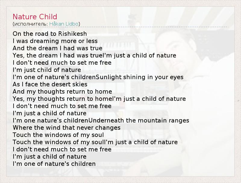 On the road to Rishikesh I was dreaming more or less And the dream I had was true Yes, the dream I had was trueI'm just a child of nature I don't need much to set me free I'm just child of nature I'm one of nature's childrenSunlight shining in your eyes As I face the desert skies And my thoughts return to home Yes, my thoughts return to homeI'm just a child of nature I don't need much to set me free I'm just a child of nature I'm one nature's childrenUnderneath the mountain ranges Where the wind that never changes Touch the windows of my soul Touch the windows of my soulI'm just a child of nature I don't need much to set me free I'm just a child of nature I'm one of nature's children
