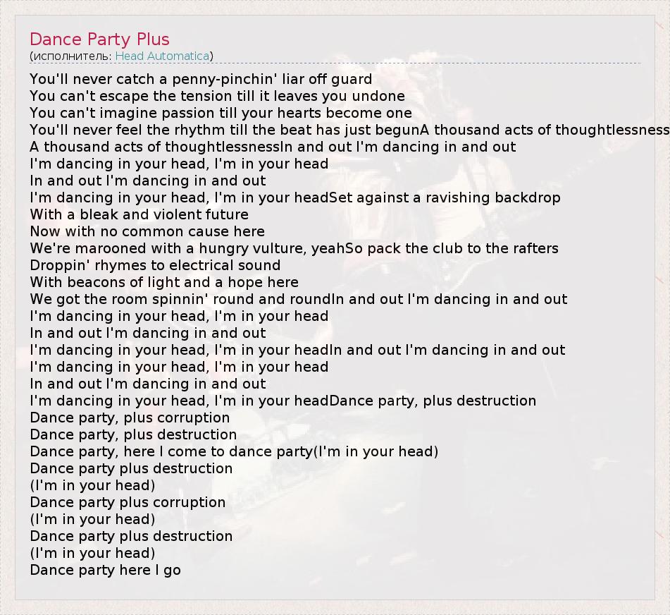 I'm dancing in your head, I'm in your headDance party, plus destruction