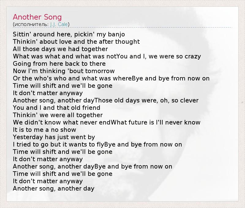 Sittin' around here, pickin' my banjo Thinkin' about love and the after thought All those days we had together What was what and what was notYou and I, we were so crazy Going from here back to there Now I'm thinking 'bout tomorrow Or the who's who and what was whereBye and bye from now on Time will shift and we'll be gone It don't matter anyway Another song, another dayThose old days were, oh, so clever You and I and that old friend Thinkin' we were all together We didn't know what never endWhat future is I'll never know It is to me a no show Yesterday has just went by I tried to go but it wants to flyBye and bye from now on Time will shift and we'll be gone It don't matter anyway Another song, another dayBye and bye from now on Time will shift and we'll be gone It don't matter anyway Another song, another day