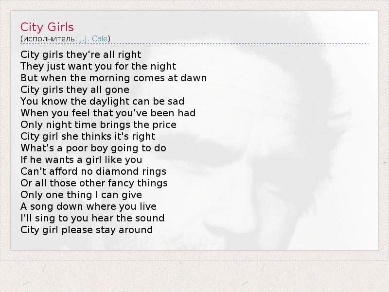 City girls they're all right They just want you for the night But when the morning comes at dawn City girls they all gone You know the daylight can be sad When you feel that you've been had Only night time brings the price City girl she thinks it's right What's a poor boy going to do If he wants a girl like you Can't afford no diamond rings Or all those other fancy things Only one thing I can give A song down where you live I'll sing to you hear the sound City girl please stay around