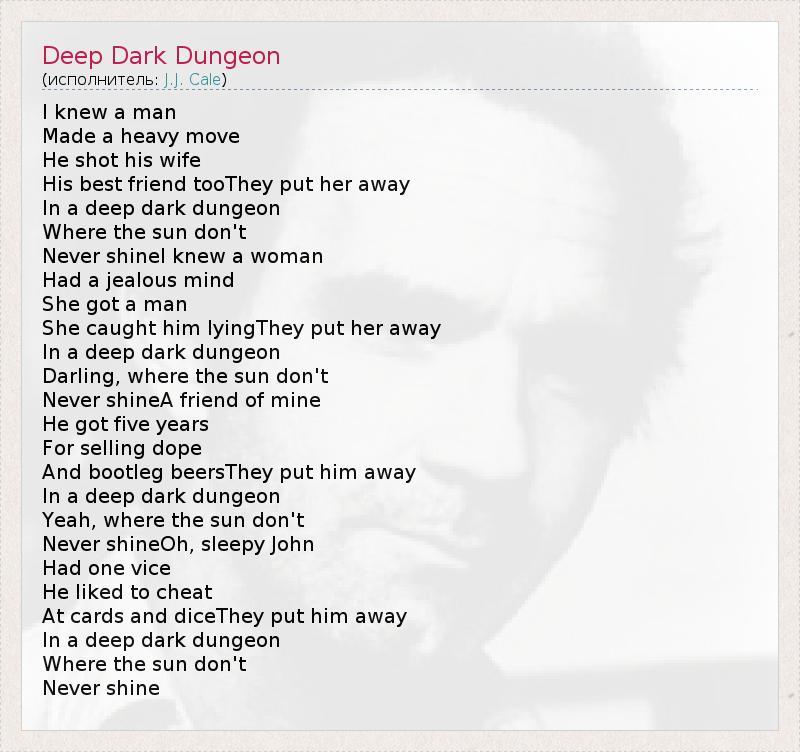 I knew a man Made a heavy move He shot his wife His best friend tooThey put her away In a deep dark dungeon Where the sun don't Never shineI knew a woman Had a jealous mind She got a man She caught him lyingThey put her away In a deep dark dungeon Darling, where the sun don't Never shineA friend of mine He got five years For selling dope And bootleg beersThey put him away In a deep dark dungeon Yeah, where the sun don't Never shineOh, sleepy John Had one vice He liked to cheat At cards and diceThey put him away In a deep dark dungeon Where the sun don't Never shine