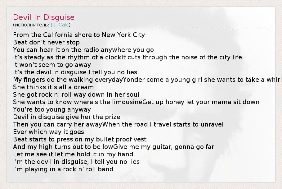 From the California shore to New York City Beat don't never stop You can hear it on the radio anywhere you go It's steady as the rhythm of a clockIt cuts through the noise of the city life It won't seem to go away It's the devil in disguise I tell you no lies My fingers do the walking everydayYonder come a young girl she wants to take a whirl She thinks it's all a dream She got rock n' roll way down in her soul She wants to know where's the limousineGet up honey let your mama sit down You're too young anyway Devil in disguise give her the prize Then you can carry her awayWhen the road I travel starts to unravel Ever which way it goes Beat starts to press on my bullet proof vest And my high turns out to be lowGive me my guitar, gonna go far Let me see it let me hold it in my hand I'm the devil in disguise, I tell you no lies I'm playing in a rock n' roll band