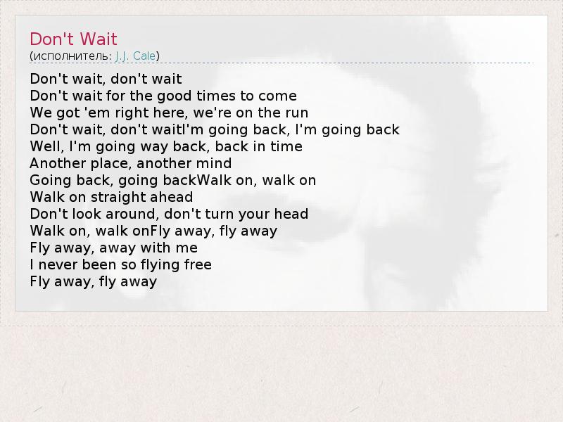 Don't wait, don't wait Don't wait for the good times to come We got 'em right here, we're on the run Don't wait, don't waitI'm going back, I'm going back Well, I'm going way back, back in time Another place, another mind Going back, going backWalk on, walk on Walk on straight ahead Don't look around, don't turn your head Walk on, walk onFly away, fly away Fly away, away with me I never been so flying free Fly away, fly away