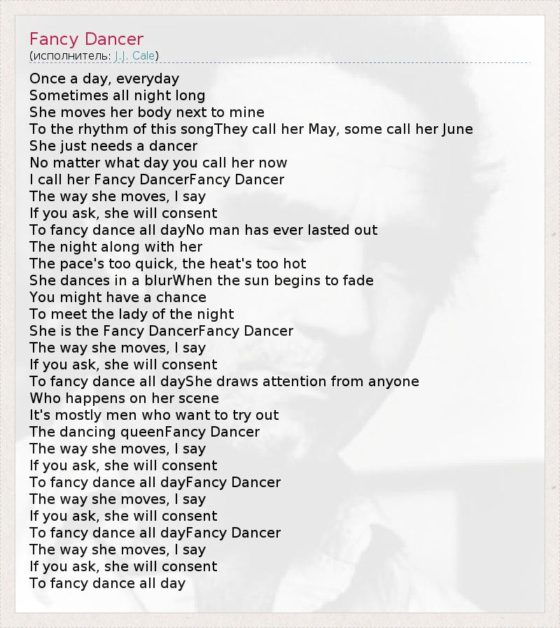Once a day, everyday Sometimes all night long She moves her body next to mine To the rhythm of this songThey call her May, some call her June She just needs a dancer No matter what day you call her now I call her Fancy DancerFancy Dancer The way she moves, I say If you ask, she will consent To fancy dance all dayNo man has ever lasted out The night along with her The pace's too quick, the heat's too hot She dances in a blurWhen the sun begins to fade You might have a chance To meet the lady of the night She is the Fancy DancerFancy Dancer The way she moves, I say If you ask, she will consent To fancy dance all dayShe draws attention from anyone Who happens on her scene It's mostly men who want to try out The dancing queenFancy Dancer The way she moves, I say If you ask, she will consent To fancy dance all dayFancy Dancer The way she moves, I say If you ask, she will consent To fancy dance all dayFancy Dancer The way she moves, I say If you ask, she will consent To fancy dance all day