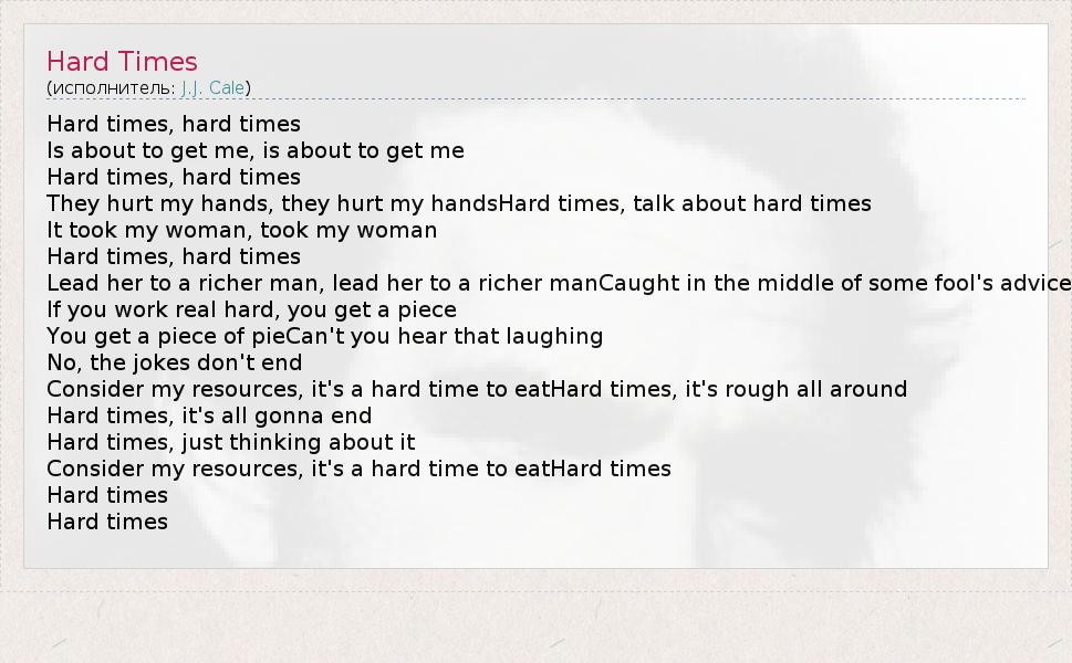 Hard times, hard times Is about to get me, is about to get me Hard times, hard times They hurt my hands, they hurt my handsHard times, talk about hard times It took my woman, took my woman Hard times, hard times Lead her to a richer man, lead her to a richer manCaught in the middle of some fool's advice If you work real hard, you get a piece You get a piece of pieCan't you hear that laughing No, the jokes don't end Consider my resources, it's a hard time to eatHard times, it's rough all around Hard times, it's all gonna end Hard times, just thinking about it Consider my resources, it's a hard time to eatHard times Hard times Hard times