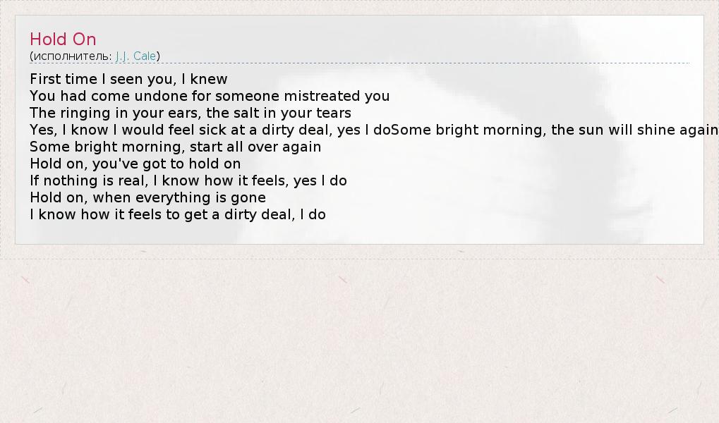 First time I seen you, I knew You had come undone for someone mistreated you The ringing in your ears, the salt in your tears Yes, I know I would feel sick at a dirty deal, yes I doSome bright morning, the sun will shine again Some bright morning, start all over again Hold on, you've got to hold on If nothing is real, I know how it feels, yes I do Hold on, when everything is gone I know how it feels to get a dirty deal, I do