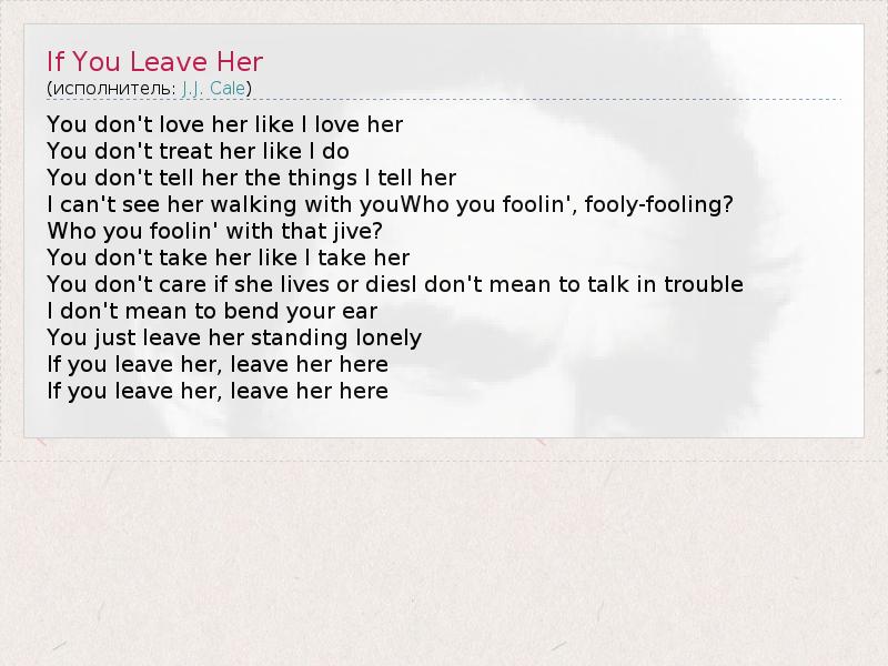 You don't love her like I love her You don't treat her like I do You don't tell her the things I tell her I can't see her walking with youWho you foolin', fooly-fooling? Who you foolin' with that jive? You don't take her like I take her You don't care if she lives or diesI don't mean to talk in trouble I don't mean to bend your ear You just leave her standing lonely If you leave her, leave her here If you leave her, leave her here