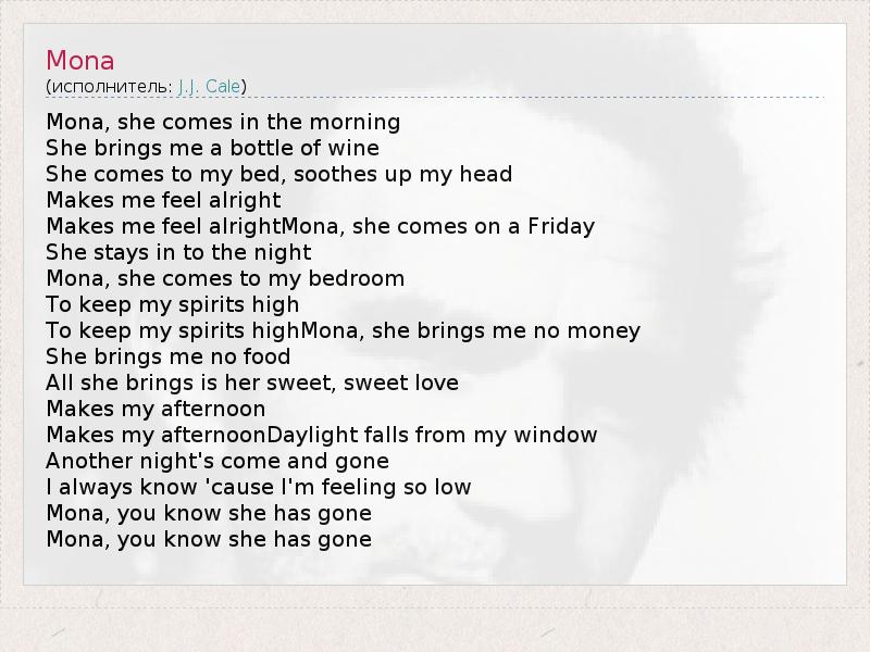 Mona, she comes in the morning She brings me a bottle of wine She comes to my bed, soothes up my head Makes me feel alright Makes me feel alrightMona, she comes on a Friday She stays in to the night Mona, she comes to my bedroom To keep my spirits high To keep my spirits highMona, she brings me no money She brings me no food All she brings is her sweet, sweet love Makes my afternoon Makes my afternoonDaylight falls from my window Another night's come and gone I always know 'cause I'm feeling so low Mona, you know she has gone Mona, you know she has gone