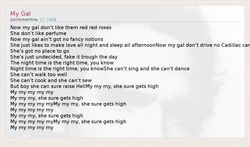 Now my gal don't like them red red roses She don't like perfume Now my gal ain't got no fancy notions She just likes to make love all night and sleep all afternoonNow my gal don't drive no Cadillac car She's got no place to go She's just undecided, fake it trough the day The night time is the right time, you know Night time is the right time, you knowShe can't sing and she can't dance She can't walk too well She can't cook and she can't sew But boy she can sure raise HellMy my my, she sure gets high My my my my my My my my, she sure gets high My my my my myMy my my, she sure gets high My my my my my My my my, she sure gets high My my my my myMy my my, she sure gets high My my my my my