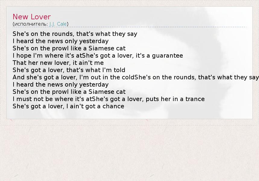 She's on the rounds, that's what they say I heard the news only yesterday She's on the prowl like a Siamese cat I hope I'm where it's atShe's got a lover, it's a guarantee That her new lover, it ain't me She's got a lover, that's what I'm told And she's got a lover, I'm out in the coldShe's on the rounds, that's what they say I heard the news only yesterday She's on the prowl like a Siamese cat I must not be where it's atShe's got a lover, puts her in a trance She's got a lover, I ain't got a chance