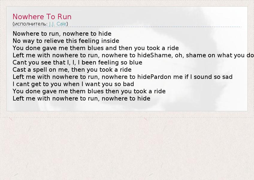 Nowhere to run, nowhere to hide No way to relieve this feeling inside You done gave me them blues and then you took a ride Left me with nowhere to run, nowhere to hideShame, oh, shame on what you do Cant you see that I, I, I been feeling so blue Cast a spell on me, then you took a ride Left me with nowhere to run, nowhere to hidePardon me if I sound so sad I cant get to you when I want you so bad You done gave me them blues then you took a ride Left me with nowhere to run, nowhere to hide