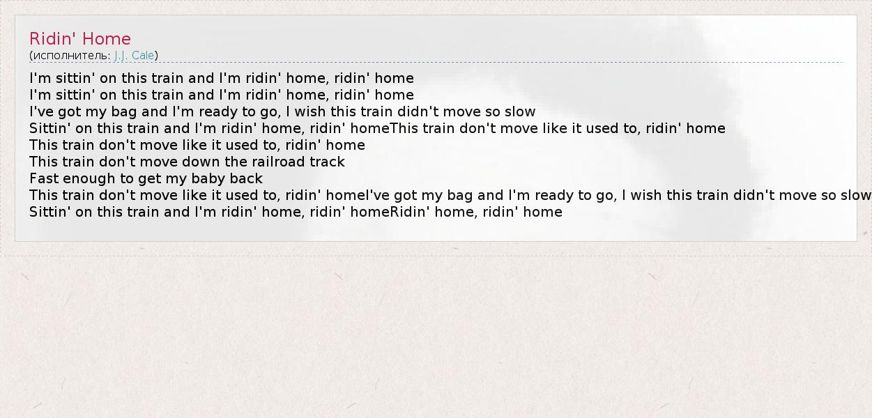 I'm sittin' on this train and I'm ridin' home, ridin' home I'm sittin' on this train and I'm ridin' home, ridin' home I've got my bag and I'm ready to go, I wish this train didn't move so slow Sittin' on this train and I'm ridin' home, ridin' homeThis train don't move like it used to, ridin' home This train don't move like it used to, ridin' home This train don't move down the railroad track Fast enough to get my baby back This train don't move like it used to, ridin' homeI've got my bag and I'm ready to go, I wish this train didn't move so slow Sittin' on this train and I'm ridin' home, ridin' homeRidin' home, ridin' home