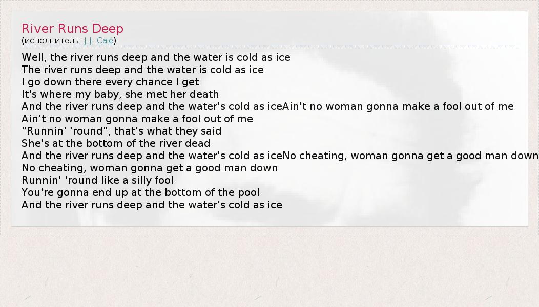 Well, the river runs deep and the water is cold as ice The river runs deep and the water is cold as ice I go down there every chance I get It's where my baby, she met her death And the river runs deep and the water's cold as iceAin't no woman gonna make a fool out of me Ain't no woman gonna make a fool out of me "Runnin' 'round", that's what they said She's at the bottom of the river dead And the river runs deep and the water's cold as iceNo cheating, woman gonna get a good man down No cheating, woman gonna get a good man down Runnin' 'round like a silly fool You're gonna end up at the bottom of the pool And the river runs deep and the water's cold as ice