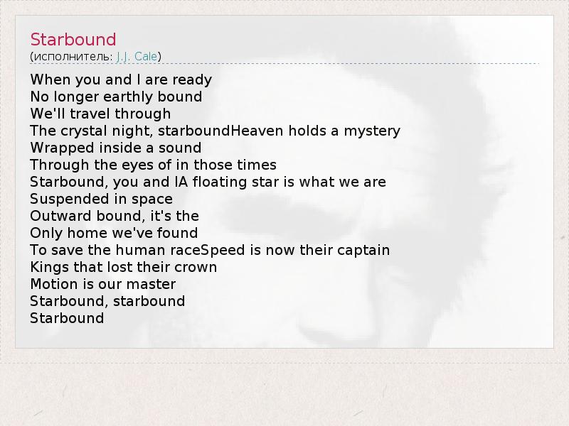 When you and I are ready No longer earthly bound We'll travel through The crystal night, starboundHeaven holds a mystery Wrapped inside a sound Through the eyes of in those times Starbound, you and IA floating star is what we are Suspended in space Outward bound, it's the Only home we've found To save the human raceSpeed is now their captain Kings that lost their crown Motion is our master Starbound, starbound Starbound