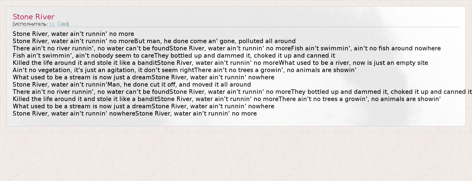 Stone River, water ain't runnin' no more Stone River, water ain't runnin' no moreBut man, he done come an' gone, polluted all around There ain't no river runnin', no water can't be foundStone River, water ain't runnin' no moreFish ain't swimmin', ain't no fish around nowhere Fish ain't swimmin', ain't nobody seem to careThey bottled up and dammed it, choked it up and canned it Killed the life around it and stole it like a banditStone River, water ain't runnin' no moreWhat used to be a river, now is just an empty site Ain't no vegetation, it's just an agitation, it don't seem rightThere ain't no trees a growin', no animals are showin' What used to be a stream is now just a dreamStone River, water ain't runnin' nowhere Stone River, water ain't runnin'Man, he done cut it off, and moved it all around There ain't no river runnin', no water can't be foundStone River, water ain't runnin' no moreThey bottled up and dammed it, choked it up and canned it Killed the life around it and stole it like a banditStone River, water ain't runnin' no moreThere ain't no trees a growin', no animals are showin' What used to be a stream is now just a dreamStone River, water ain't runnin' nowhere Stone River, water ain't runnin' nowhereStone River, water ain't runnin' no more