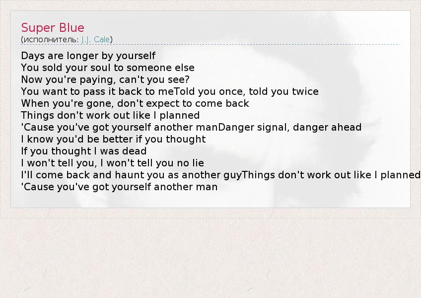 Days are longer by yourself You sold your soul to someone else Now you're paying, can't you see? You want to pass it back to meTold you once, told you twice When you're gone, don't expect to come back Things don't work out like I planned 'Cause you've got yourself another manDanger signal, danger ahead I know you'd be better if you thought If you thought I was dead I won't tell you, I won't tell you no lie I'll come back and haunt you as another guyThings don't work out like I planned 'Cause you've got yourself another man