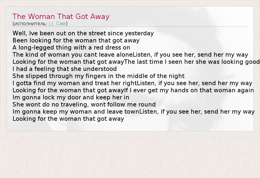 Well, Ive been out on the street since yesterday Been looking for the woman that got away A long-legged thing with a red dress on The kind of woman you cant leave aloneListen, if you see her, send her my way Looking for the woman that got awayThe last time I seen her she was looking good I had a feeling that she understood She slipped through my fingers in the middle of the night I gotta find my woman and treat her rightListen, if you see her, send her my way Looking for the woman that got awayIf I ever get my hands on that woman again Im gonna lock my door and keep her in She wont do no traveling, wont follow me round Im gonna keep my woman and leave townListen, if you see her, send her my way Looking for the woman that got away