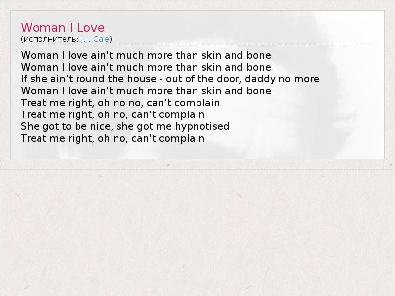 Woman I love ain't much more than skin and bone Woman I love ain't much more than skin and bone If she ain't round the house - out of the door, daddy no more Woman I love ain't much more than skin and bone Treat me right, oh no no, can't complain Treat me right, oh no, can't complain She got to be nice, she got me hypnotised Treat me right, oh no, can't complain