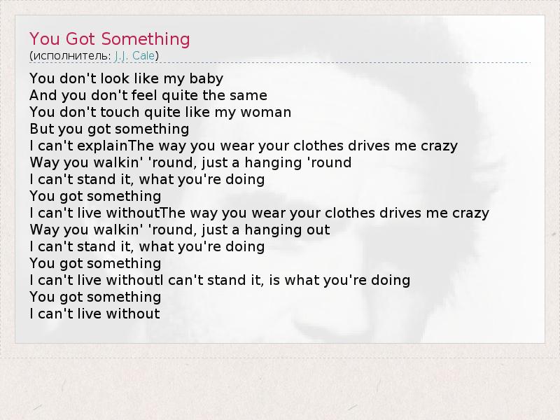 You don't look like my baby And you don't feel quite the same You don't touch quite like my woman But you got something I can't explainThe way you wear your clothes drives me crazy Way you walkin' 'round, just a hanging 'round I can't stand it, what you're doing You got something I can't live withoutThe way you wear your clothes drives me crazy Way you walkin' 'round, just a hanging out I can't stand it, what you're doing You got something I can't live withoutI can't stand it, is what you're doing You got something I can't live without