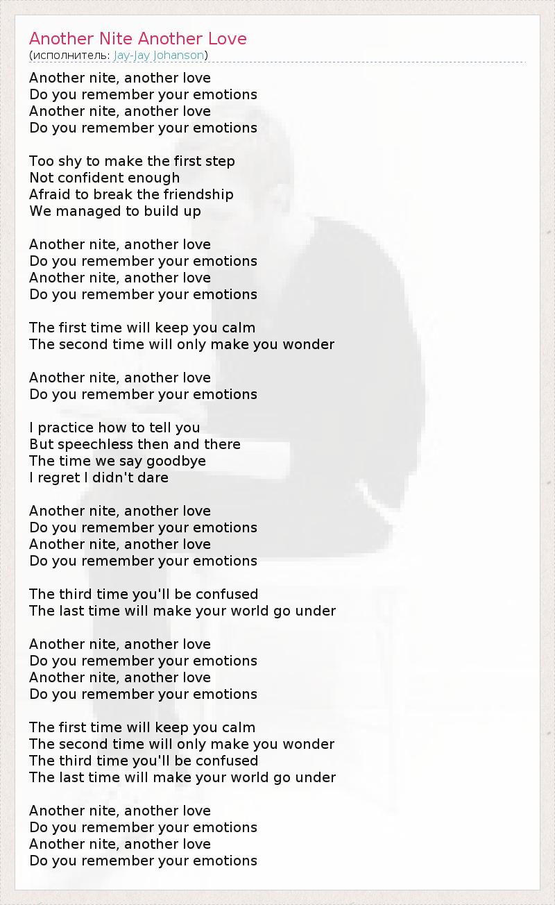 Another nite, another love Do you remember your emotions Another nite, another love Do you remember your emotions Too shy to make the first step Not confident enough Afraid to break the friendship We managed to build up Another nite, another love Do you remember your emotions Another nite, another love Do you remember your emotions The first time will keep you calm The second time will only make you wonder Another nite, another love Do you remember your emotions I practice how to tell you But speechless then and there The time we say goodbye I regret I didn't dare Another nite, another love Do you remember your emotions Another nite, another love Do you remember your emotions The third time you'll be confused The last time will make your world go under Another nite, another love Do you remember your emotions Another nite, another love Do you remember your emotions The first time will keep you calm The second time will only make you wonder The third time you'll be confused The last time will make your world go under Another nite, another love Do you remember your emotions Another nite, another love Do you remember your emotions