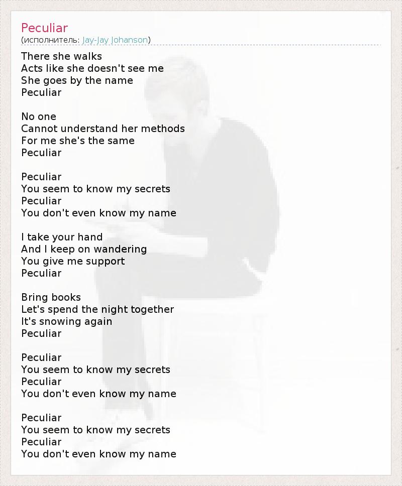 There she walks Acts like she doesn't see me She goes by the name Peculiar No one Cannot understand her methods For me she's the same Peculiar Peculiar You seem to know my secrets Peculiar You don't even know my name I take your hand And I keep on wandering You give me support Peculiar Bring books Let's spend the night together It's snowing again Peculiar Peculiar You seem to know my secrets Peculiar You don't even know my name Peculiar You seem to know my secrets Peculiar You don't even know my name