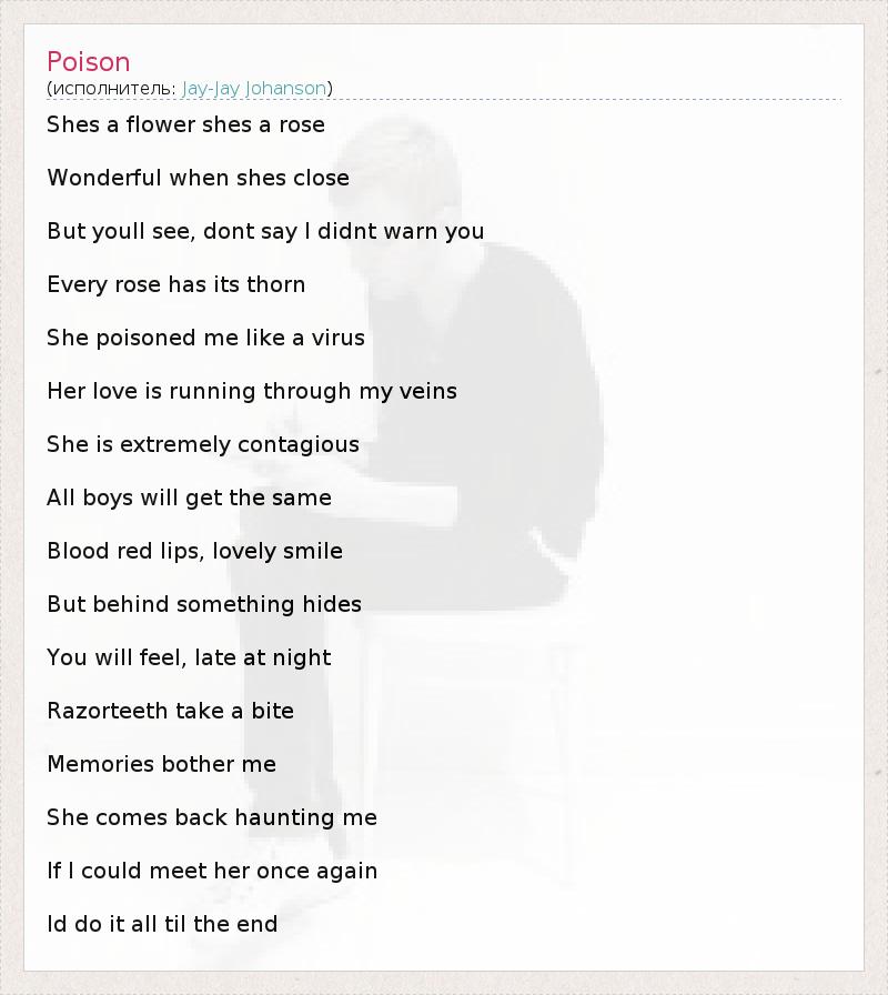 Shes a flower shes a rose Wonderful when shes close But youll see, dont say I didnt warn you Every rose has its thorn She poisoned me like a virus Her love is running through my veins She is extremely contagious All boys will get the same Blood red lips, lovely smile But behind something hides You will feel, late at night Razorteeth take a bite Memories bother me She comes back haunting me If I could meet her once again Id do it all til the end