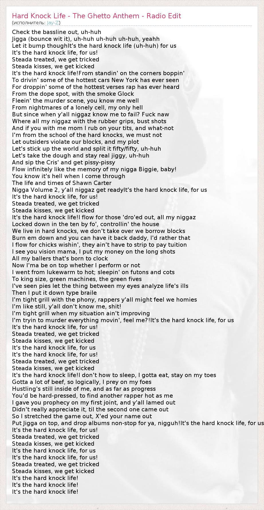 Put Jigga on top, and drop albums non-stop for ya, nigguh!It's the hard knock life, for us