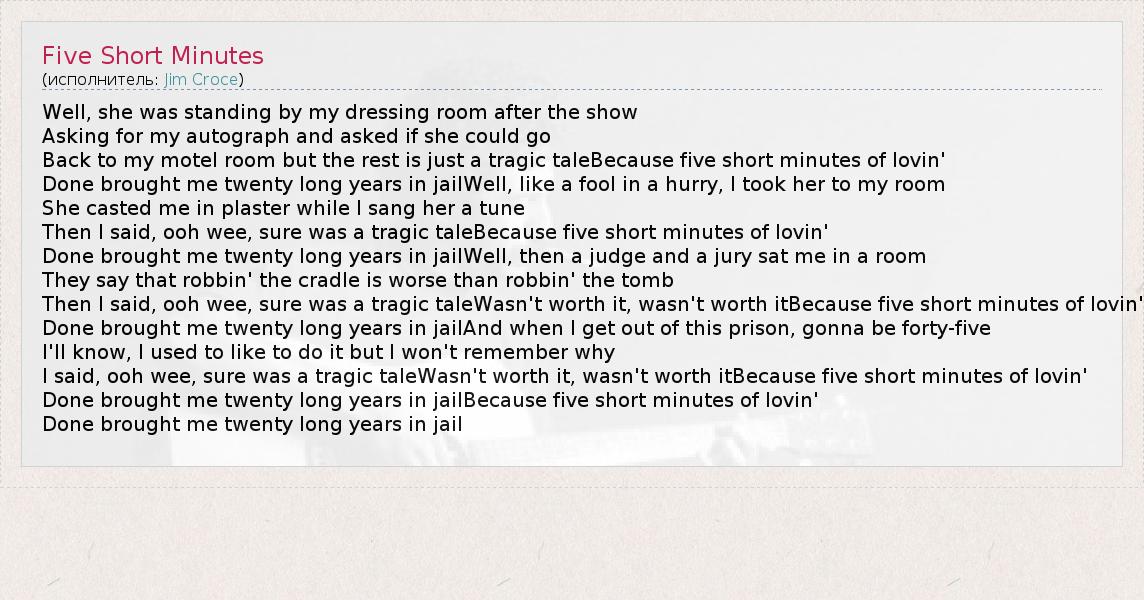 Done brought me twenty long years in jailBecause five short minutes of lovin'